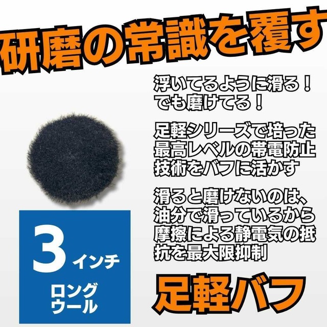 【作業者の負担を軽減】 足軽バフは、特殊な足軽加工により摩擦抵抗や静電気の影響をやわらげた新しい発想のバフです。 従来のバフでは、塗面との摩擦によってポリッシャーの動きが重く感じられたり、バフが跳ねたり振動したりすることで研磨精度が乱れるケースがありました。 足軽バフはそうした要因を軽減し、「よく滑るのに、しっかり削れる」「操作が安定して疲れにくい」といった体感をいただくことが多いのが特長です。 ■特長 1. 跳ね・叩き・振動の少ないスムーズな回転 足軽バフは塗面の上をなめらかに移動しやすく、コンパウンドを塗り広げる段階から違いを感じられる方もいらっしゃいます。 従来は摩擦抵抗によって回転がロスしていましたが、足軽加工により抵抗がやわらぎ、ポリッシャーの回転が軽快に感じられることがあります。 加圧しても回転の落ち込みが少なく「元気に回り続ける」といった印象を持たれるケースもあります。 2. 研磨力のサポート 一般的に摩擦抵抗を減らすには研磨剤の油分などで“滑り”を加える方法がありますが、その場合はコンタクト力が弱まり、研磨力が落ちやすい傾向があります。 足軽バフは除電効果によって摩擦抵抗を軽減しているため、まるで油分を加えたようにスムーズに回転しつつ、コンタクト力が保たれやすいのが特長です。 そのため「研磨剤のキレが良い」「工程がスムーズに進む」といった声をいただくことがあります。 3. 研磨精度の向上 跳ねや叩き、振動が抑えられると、研磨の精度が安定しやすくなります。 初期研磨では「傷抜きのスピードや正確さが増した」と感じられる方が多く、仕上げ研磨では「仕上がりがより美しく整いやすい」といったご感想もいただいています。 ベテランの方はもちろん、初心者の方にとっても「研磨に集中しやすい」と感じられることがあり、結果的に疲労の軽減にもつながるケースがあります。 4. 研磨熱の抑制 摩擦抵抗は熱を生み、塗面温度を上昇させやすい要因です。塗面温度が上がると「傷戻り」などのトラブルにつながる可能性があります。 足軽バフは摩擦抵抗がやわらぐことで熱の発生も抑えられやすく、結果的に「傷戻りが減った」「仕上がりが安定した」と感じられるユーザーもいらっしゃいます。 5. 作業環境の快適さ 余計な抵抗が少ないため、ポリッシャーの操作が軽く感じられることがあります。 「長時間の作業でも疲れにくい」「集中力が持続しやすい」といった体感をいただくことも多く、作業環境の快適性をサポートします。 ■ラインナップ ・ロングウール:強い研磨力と安定性を両立。素早い傷抜きから仕上げまで対応しやすいタイプ 5インチ https://tokusentai.saleshop.jp/items/115994759 3インチ https://tokusentai.saleshop.jp/items/115994868 ・ウレタンミディアム(イエロー):中間~仕上げ研磨向け。オールラウンダーで使いやすいと評判 5インチ https://tokusentai.saleshop.jp/items/115994955 3インチ https://tokusentai.saleshop.jp/items/115995006 ・ウレタンソフト(グレー):最終仕上げ研磨向け。制度高く仕上がると評判 5インチ https://tokusentai.saleshop.jp/items/118476928 3インチ https://tokusentai.saleshop.jp/items/118477563 ■まとめ 足軽バフは「よく滑るのに削れる感覚」「疲れにくく仕上げやすい」といった体感をいただいている新しい発想のバフです。 研磨に慣れている方ほど、「滑る=研磨力が落ちる」という感覚があるかと思います。 足軽バフの滑りは、油分などによる滑りではなく、静電気などによる抵抗を取り除くことによる滑りです。 そのため、滑るのに磨ける、といった声を多くいただいております。 効果の感じ方は使用環境やコンパウンド、施工者の技量などによって異なりますが、多くのユーザー様から「作業性が良い」「仕上がりがきれい」といった感想をいただいております。 ぜひ一度、これまでのバフとの違いをご自身でお試しください。 ■商品仕様 【サイズ】 3インチ 寸法:外径90mm × ベルクロ径80mm センター:Φ15mm 毛の長さ:約15mm 【枚数】 1枚 【色】 黒 ■使用上の注意 ・本来の用途以外に使用しないでください。 ・小さなお子様の手の届く場所に保管しないでください。 ・使用箇所が冷えていることを確認してから使用してください。高温な箇所やエンジン周りなどの機械部分には使用しないでください。 ・本品に砂やゴミなどが付着した まま使用すると傷の原因となりますので、洗い落としてから使用してください。 ・本品を汚れがひどい場所に使用した場合は、必ず本品をよく洗い、異物などを取り除いてから使用してください。 ・火気のそばや直射日光が当たる場所、高温になる場所には置かないでください。 ・本品は消耗品です。使用し続けることによって、素材が磨耗劣化します。古くなった場合や劣化した場合は使用しないでください。 ・洗濯する際は中性洗剤を使用してください。 ・素材の劣化につながりますので、塩素系洗剤・蛍光洗剤は使用しないでください。 ・乾燥機は使用しな