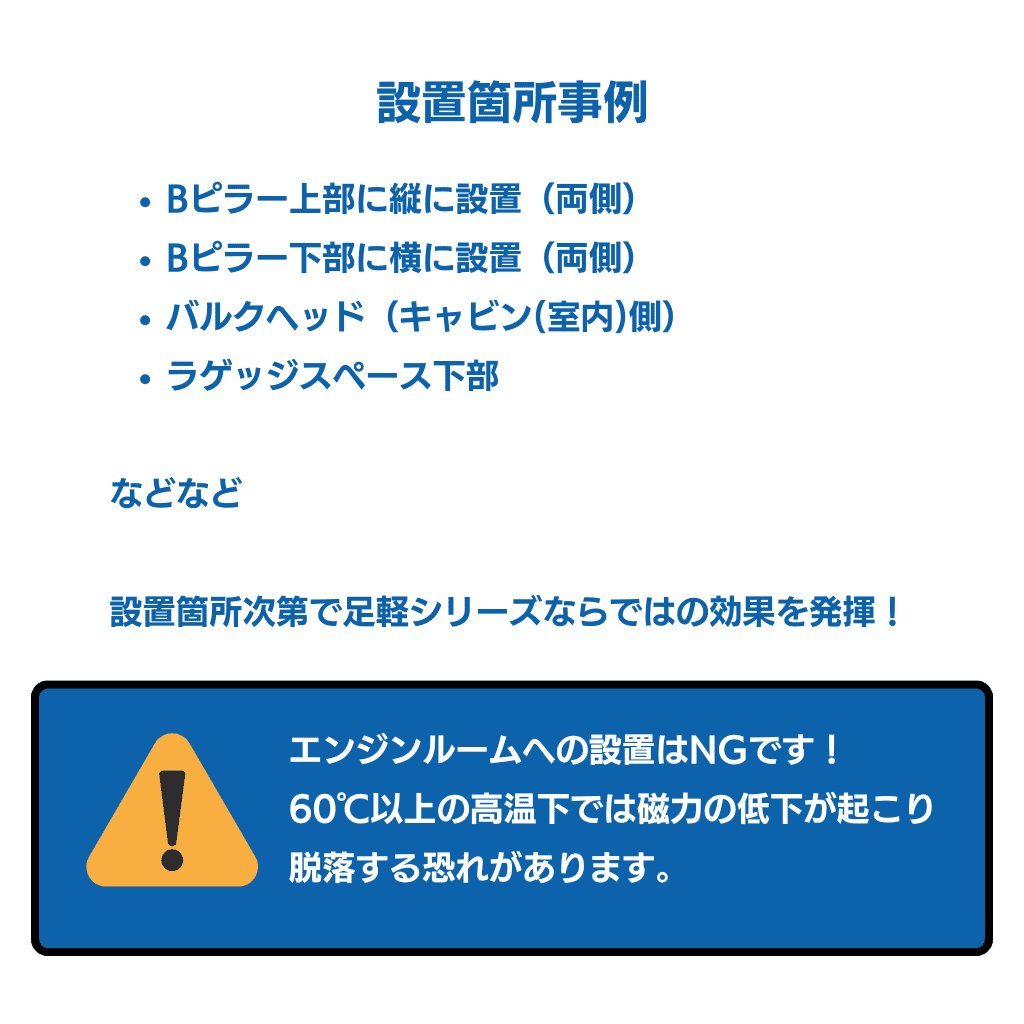 ※エンジンルームへの設置は避けてください。熱により脱落する恐れがあります